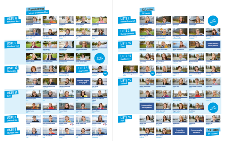Mit dieser Frauen-Offensive soll der Frauenanteil in der Grossratsfraktion erhöht werden. 91 motivierte und kompetente Kandidatinnen stellen sich zur Wahl und sind bereit Verantwortung als Grossrätin zu übernehmen. Die Kandidatinnen sind zwischen 24 und 70 jährig, vertreten alle möglichen Berufsgruppen und setzen sich in ihren Gemeinden in verschieden Funktionen in der Politik, Vereinen oder Institutionen ein.